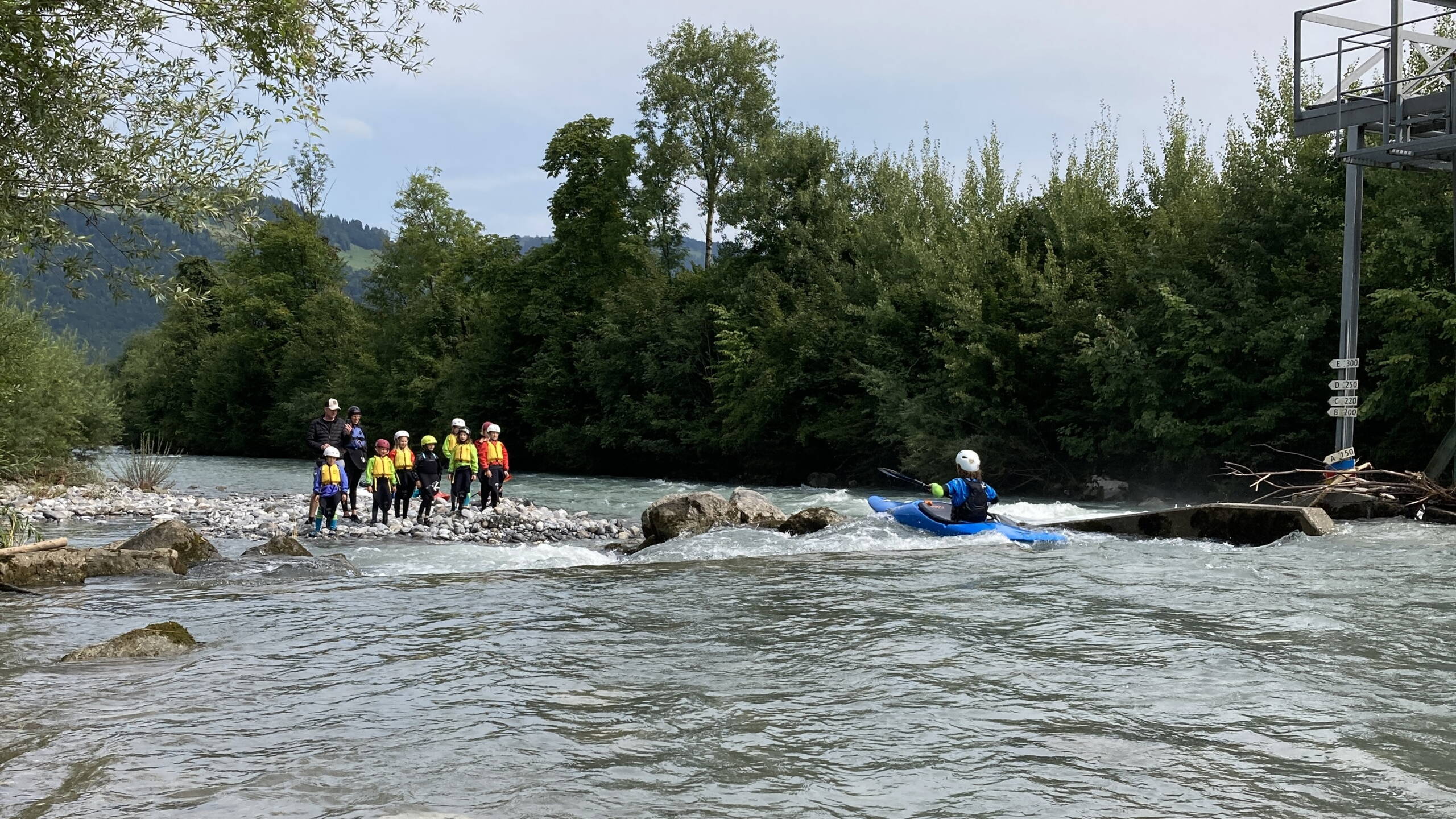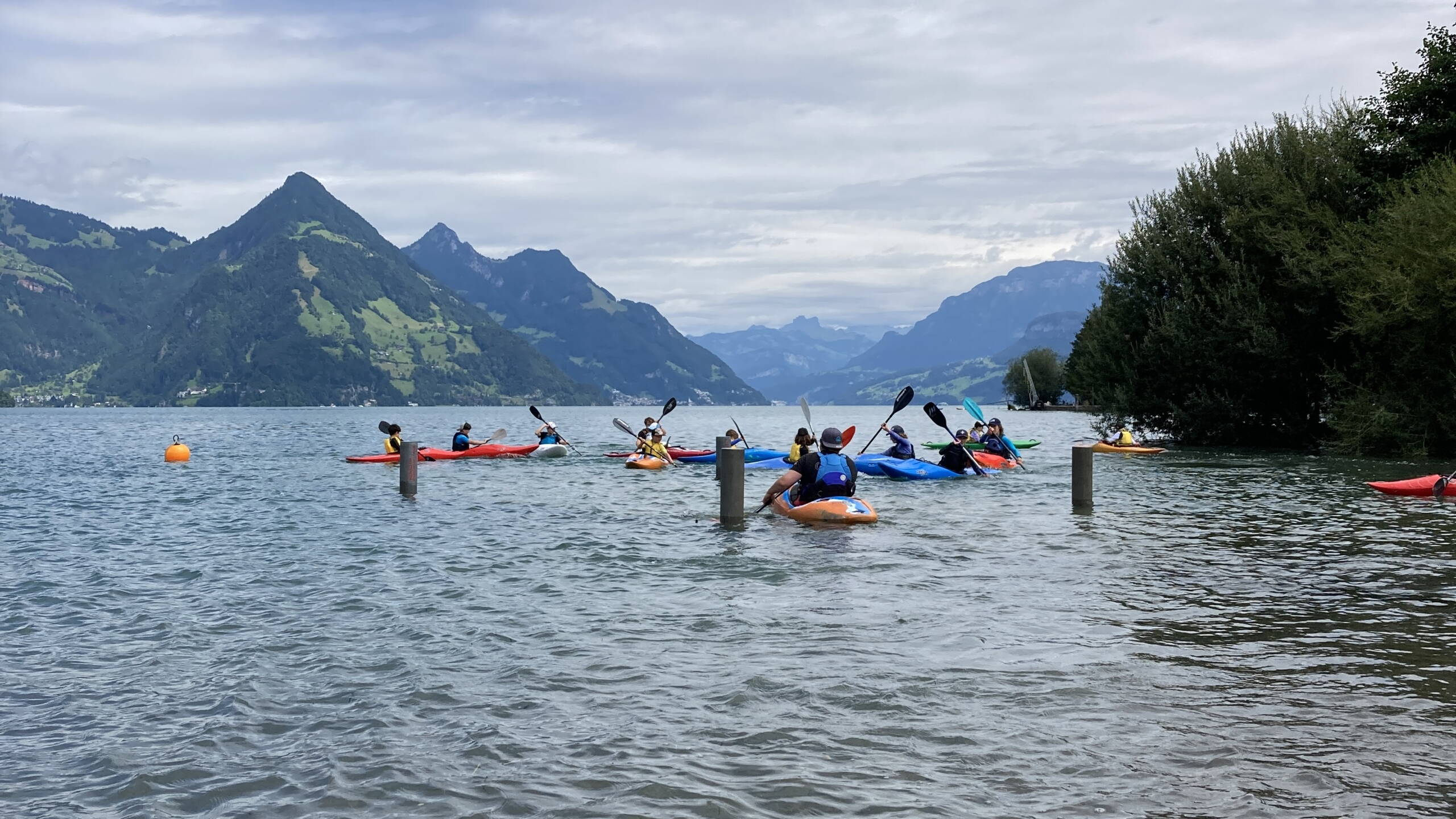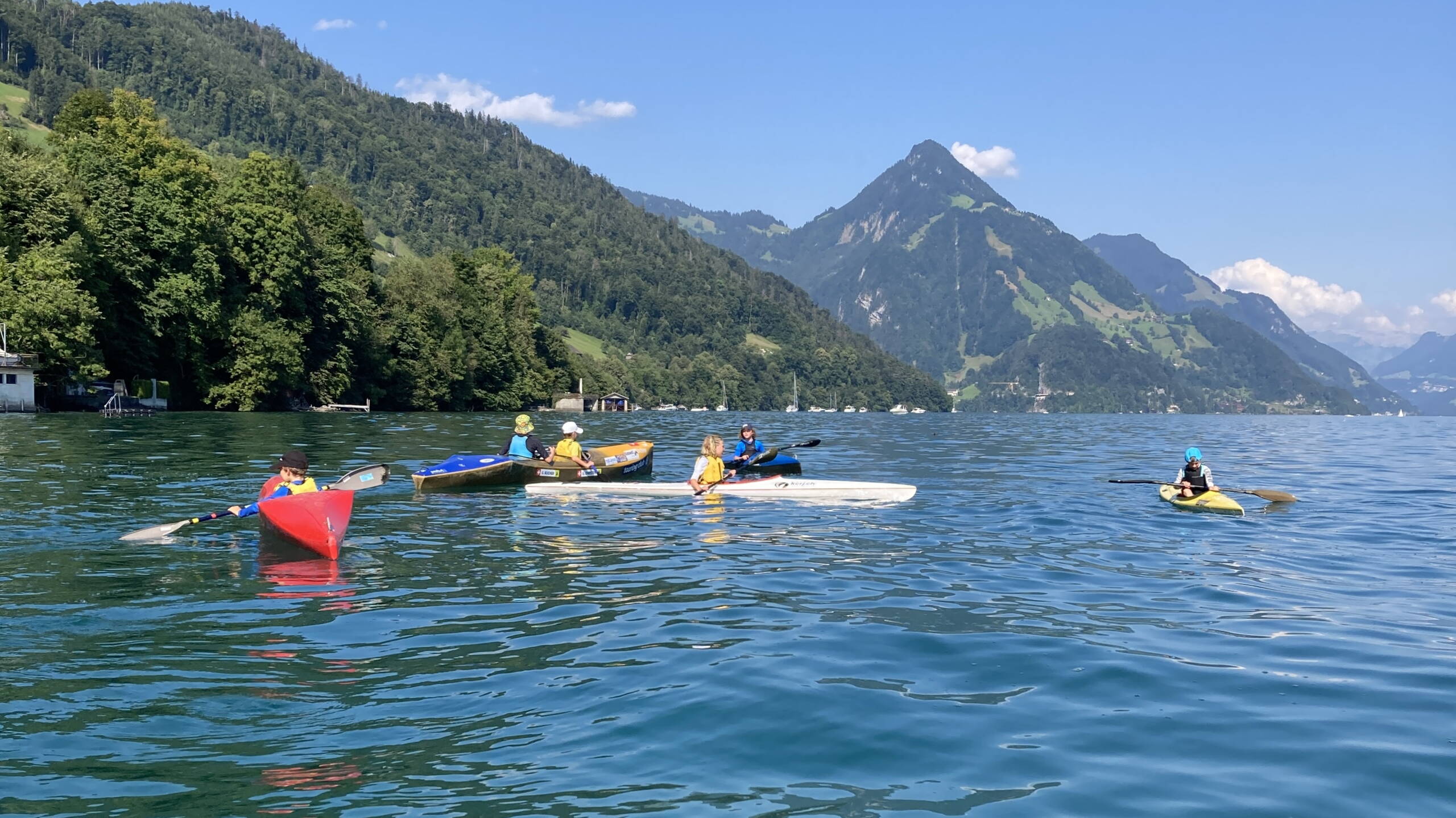 Nach dem Frühstück haben wir uns fürs Wasser bereitgemacht. Zuerst sind wir Slalom gefahren: erst in Stafetten, dann durch einen Slalomkurs. Nach dem Zmittag stand die Abfahrt auf dem Programm. Wir sind auf die andere Seite gepaddelt und haben dort einen Parcours absolviert, bevor wir wieder zurückgepaddelt sind. Danach wartete eine warme Dusche und Spiele, bis es Abendessen gab.