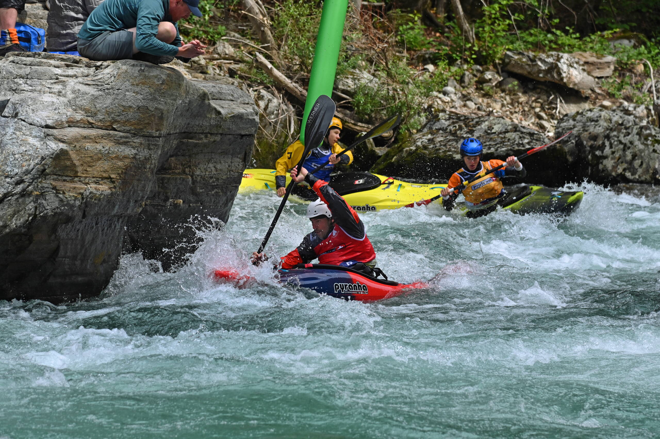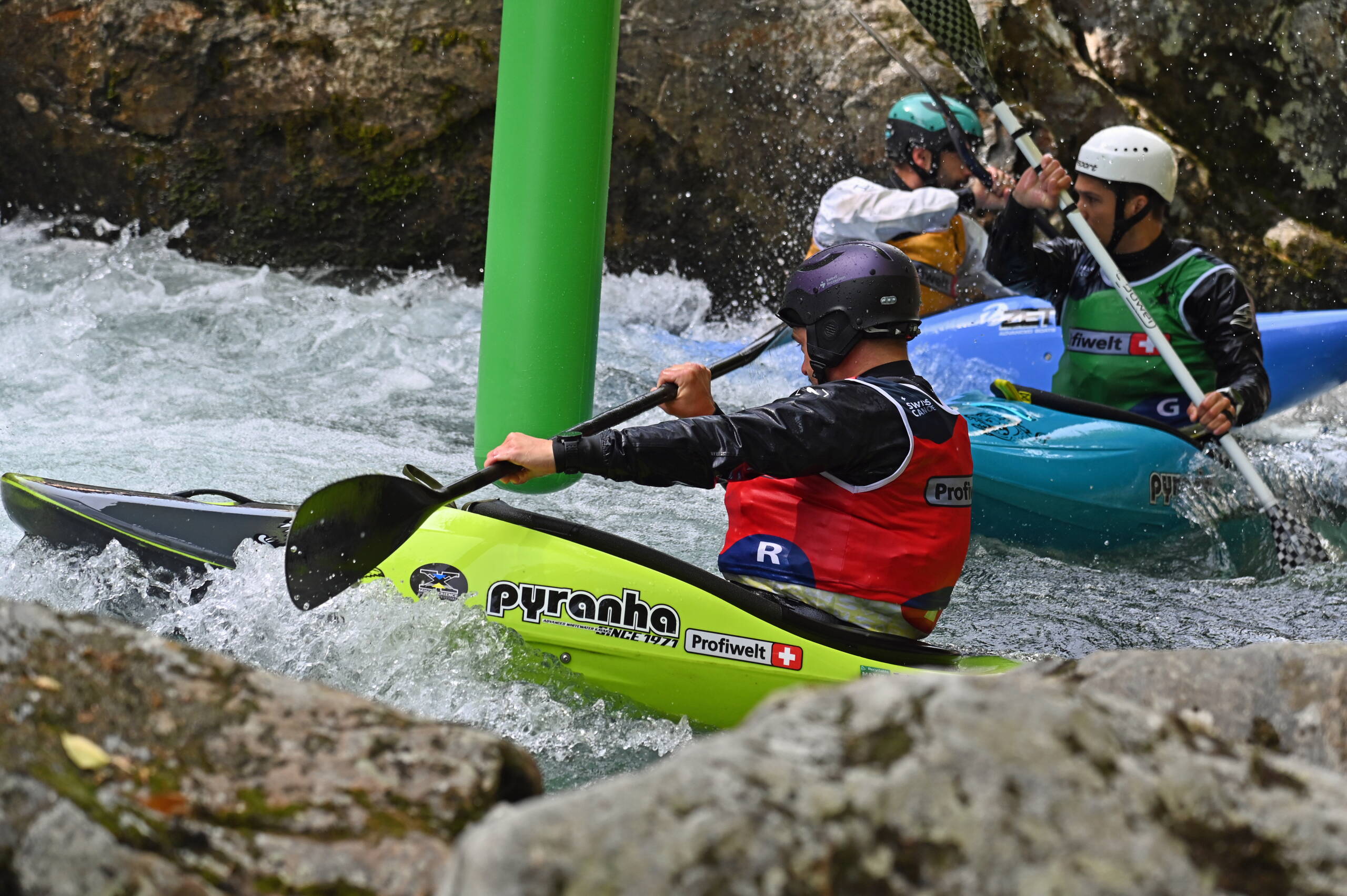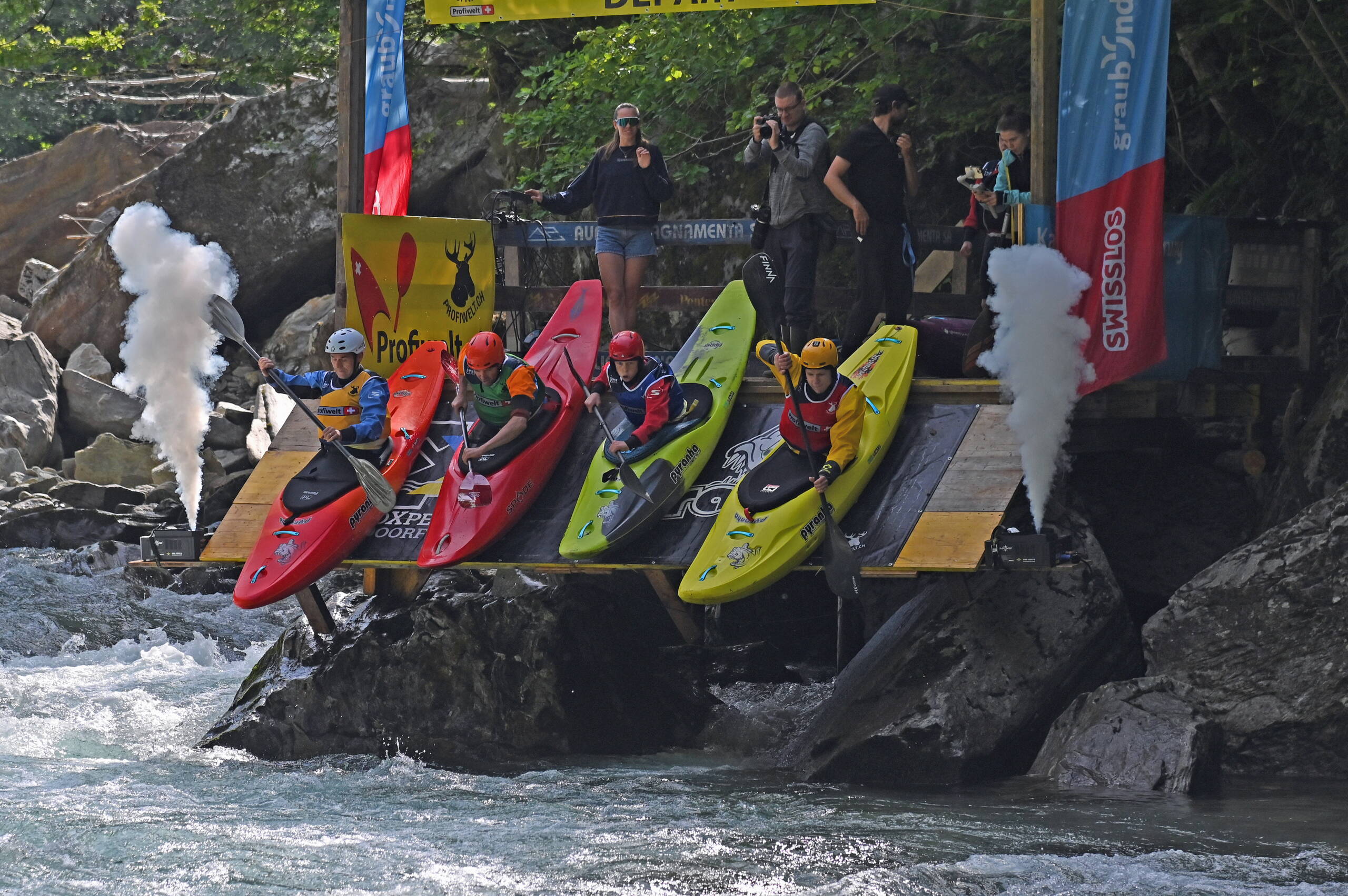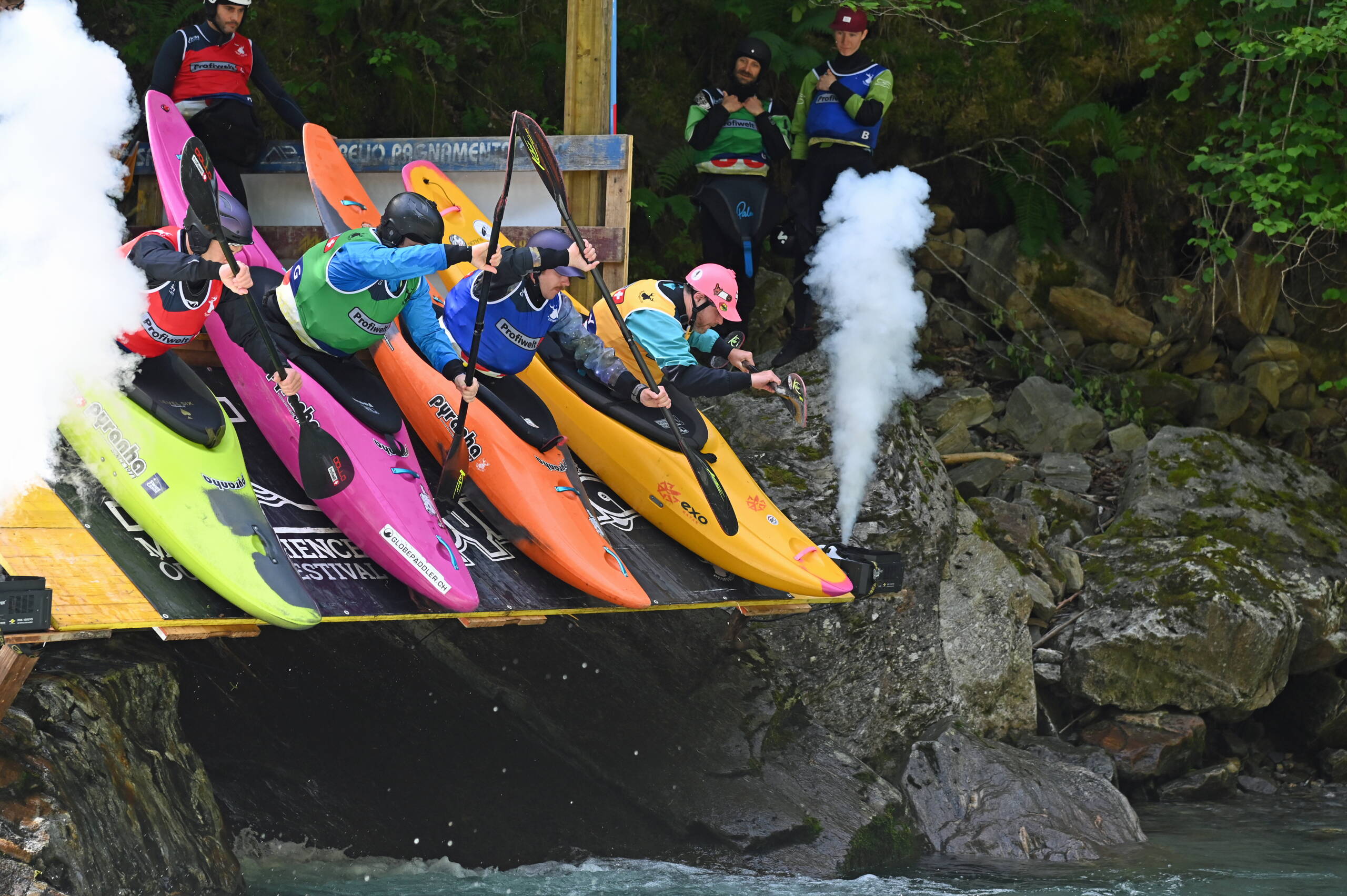 Am Freitag war dann der erste Renntag, welcher am Morgen mit dem Friendly Race startete und am Nachmittag mit dem Pinnball Race aufhörte. Es war toll, so viele aktive Paddler:innen in Action zu sehen. Die Finalläufe am Samstag, welche dieses Jahr etwas näher am Festivalgelände durchgeführt wurden, waren auch actiongepackt. Schlussendlich konnte bei den Herren einmal mehr die Pyranha Vertretung, dieses Jahr mit Huw Butterworth, gewinnen, bei den Damen ging der Titel dieses Jahr zu Gianna Caduff nach Graubünden.