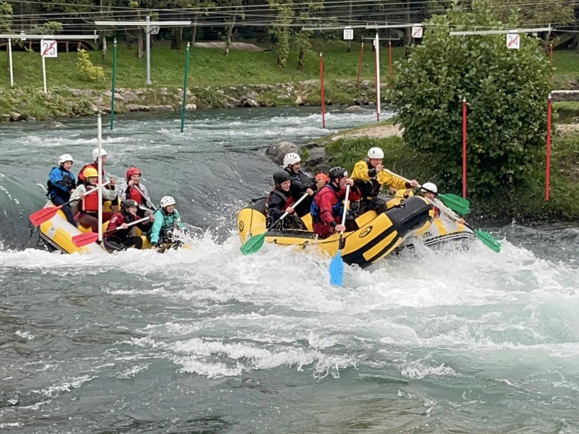 Kurz vor der Grenze zu Frankreich treffen wir auf die anderen Autos, alle mit Anhänger, alle voll mit Teilnehmenden aus der ganzen Schweiz. Dort haben wir gemeinsam zu Mittag gegessen. Weiter ging die Fahrt bis zum Lagerhaus. Wir haben uns dann erst mal eingerichtet und so weiter. Später durften wir noch aufs Wasser. Wir haben in 2 Gruppen den Kanal kennengelernt. Viele hatten vom Wasserfall Respekt und sind bei den 3 Wellen geschwommen. Der Start ist chaotisch, die Stimmung gut.