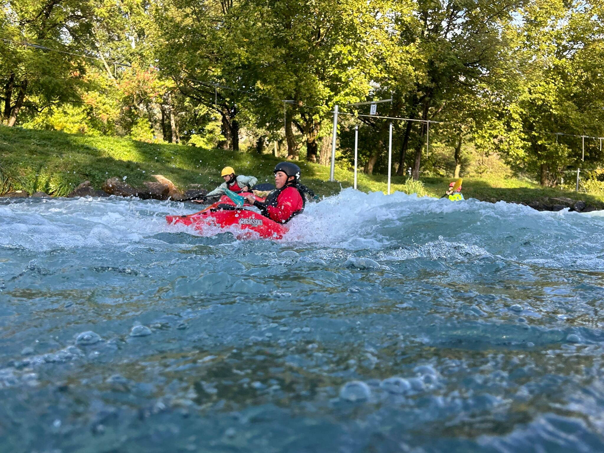 Wir begannen den Donnerstag mit einem 3 km langen Jogginglauf mit Jojo. Das Wetter war nicht besonders gut, da es neblig war, aber es hat trotzdem Spass gemacht. Anschliessend haben wir ein Kajak-Polo-Turnier mit 5 Teams veranstaltet, mit Musikbegleitung, aber zum Glück war das Wetter gut. Es war lustig, denn oben auf der Mauer tanzten einige Teilnehmer:innen während ihrer Spielpause. Wir hatten viel Spass. Mittags haben wir uns ausgeruht, weil wir müde waren, es war der fünfte Tag des Camps. Am Nachmittag haben wir Fussball und Unihockey gespielt. Unihockey war lustig, weil wir mit Pommes frites [Poolnudeln] als Schläger gespielt haben, da wir keine richtigen Unihockey-Schläger hatten. Danach konnten diejenigen, die wollten, im Kanal Kajak fahren und in der Welle unterhalb des Hauses surfen. Ich habe mitgemacht und es war sehr cool, weil wir in den Wellen des Kanals und auch in der grossen Welle unten gesurft sind. Sie ist beeindruckend, aber es ist so cool! Ich habe es geschafft, in der grossen Welle eine 360°-Drehung zu machen, was sehr cool war. Danach haben wir zu Abend gegessen und verschiedene Challenges für jede Leiter:in gemacht. Es gab ein Quiz mit Cannelle, ein Casino mit Linus usw. Viele coole Aktivitäten. Das Gewinner:innenteam war das Team X̌amax. Nach den verschiedenen Challenges sind wir schlafen gegangen und der Tag war zu Ende.